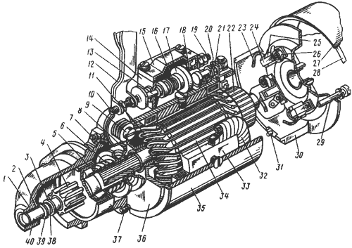 Смазать смазкой эвольвентные шлицы вала 40 или направляющей втулки, пальцы и ось 9 рычага 12, подшипники и шейки вала. Проверку состояния коллектора и ремонт стартера проводить в специализированной мастерской.