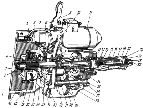 Проверить состояние щеток 25 (см. рис. 22), щеткодержателей 24 и перемещение щеток в щеткодержателях. Щетки должны двигаться свободно, без заеданий. При износе щеток до высоты менее 6 мм заменить их. Проверить состояние контактов включателя. Подгоревшие контакты зачистить напильником или повернуть контактные болты на 180°, а контактный диск 17 - другой стороной.